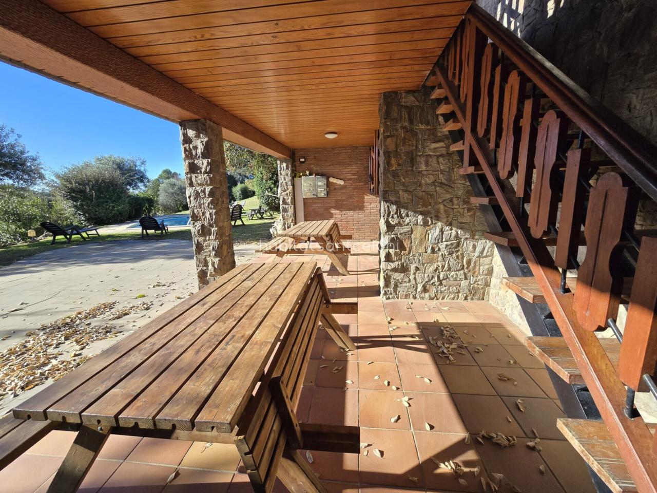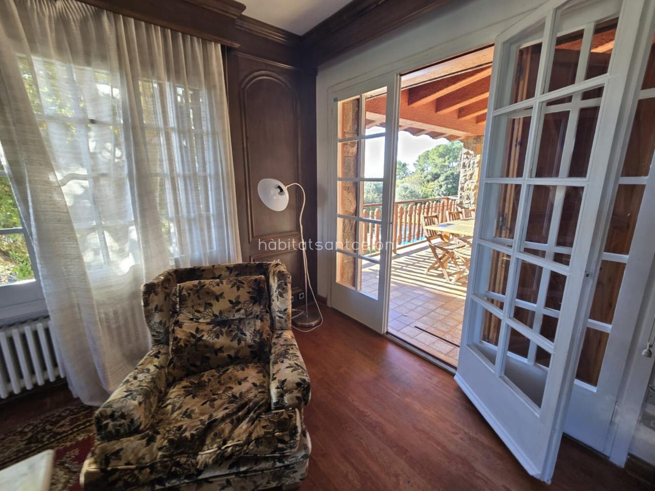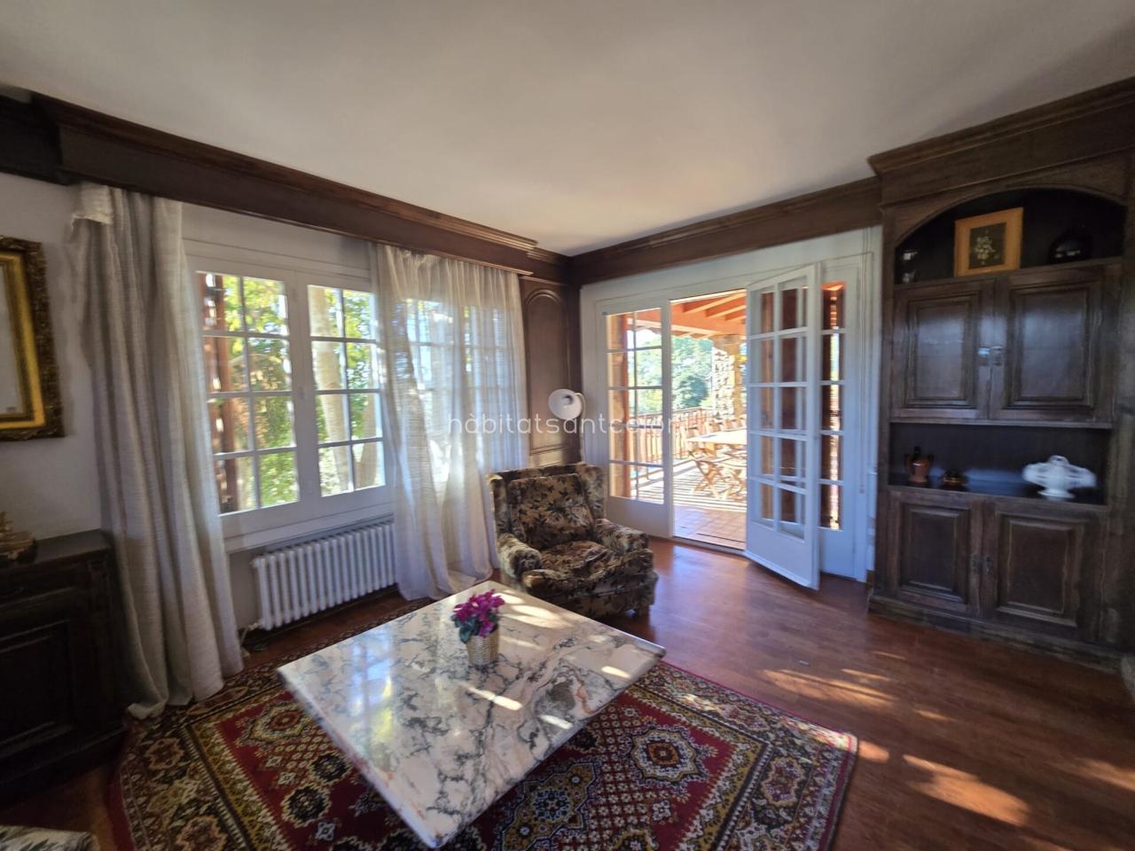 Dispone de una amplia cocina con zona de lavadero, 1 aseo, 2 habitaciones, 1 despacho y un gran salón-comedor con chimenea y techos de madera, muy luminoso, con salida directa a una terraza cubierta completamente equipada, ideal para reuniones y momentos de relax con vistas al jardín.