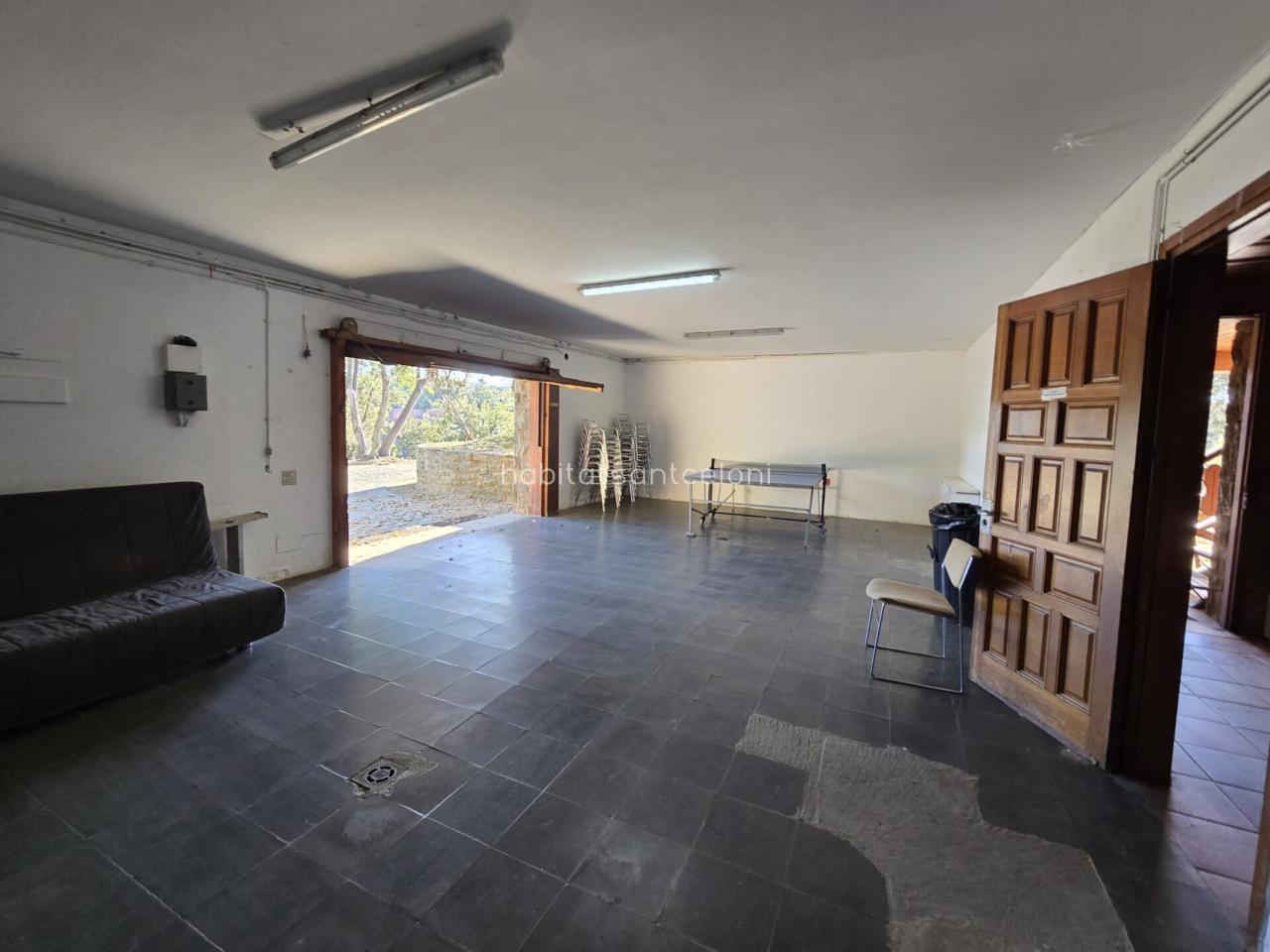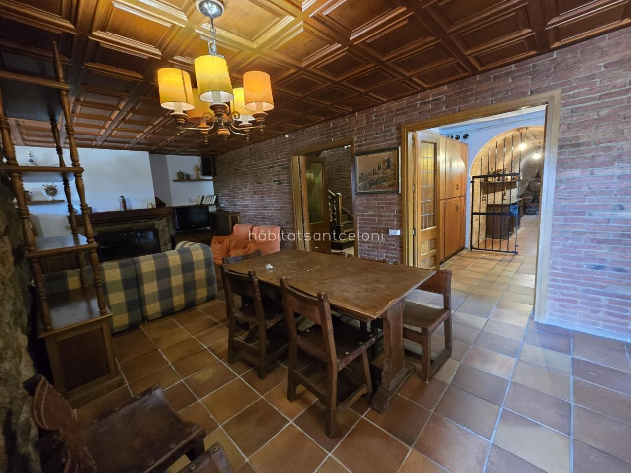 Encontramos 1 aseo, una acogedora sala de estar con chimenea, una bodega con mucho encanto y el garaje, con salida directa al jardín y a un porche junto a la piscina y la barbacoa.